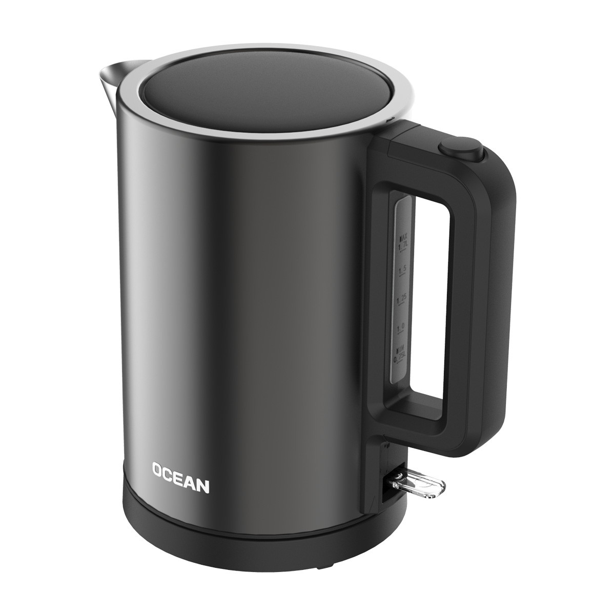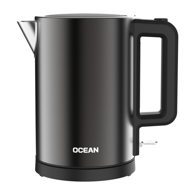 Bollitore cordless 1850–2200 W corpo in acciaio inox con finitura grigio scuro e coperchio in plastica con finestra livello acqua spegnimento automatico/manuale protezione contro il surriscaldamento a secco resistenza riscaldante nascosta.